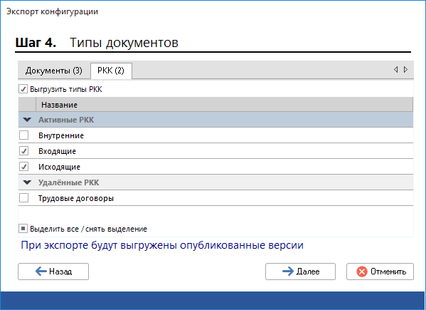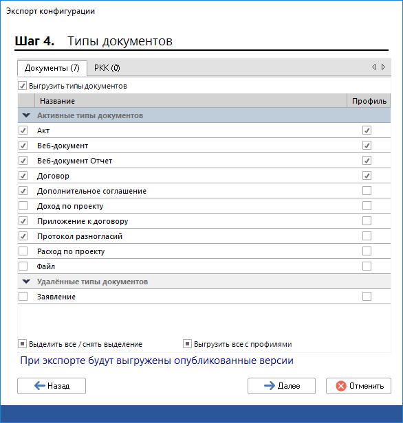 На данном шаге необходимо выбрать типы документов и РКК, которые необходимо экспортировать. Следует отметить, что при экспорте будут выгружены последние опубликованные версии выбранных типов документов и РКК. Список документов представлен в виде двух сворачиваемых списков. В списке Активные типы документов отображены действующие типы, а в списке Удаленные типы документов типы, которые были удалены. Группировка также доступна для типов РКК и проектов.