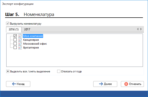 Данное диалоговое окно состоит из нескольких вкладок: названия вкладок – годы, за которые имеется созданная номенклатура. Справа от названия вкладки (в скобках) отображена цифра, которая обозначает количество выбранных объектов для экспорта на данной вкладке.