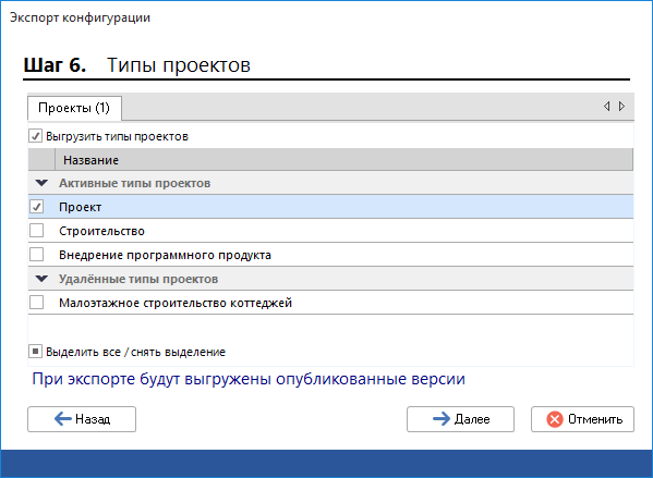 На данном шаге (рис. 11) необходимо указать типы проектов, которые необходимо экспортировать. Справа от названия вкладки (в скобках) отображена цифра, которая обозначает количество выбранных объектов для экспорта на данной вкладке. Экспортированы будут только опубликованные версии типов проектов.