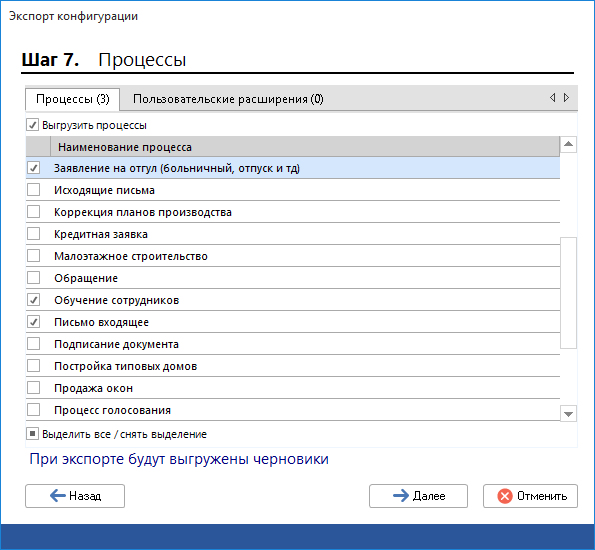 Выделить все / снять выделение – при установке данного флажка произойдет автоматическое выделение всех бизнес-процессов, доступных для экспорта.