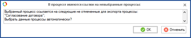 Следует отметить, что при наличии в системе связанных процессов и выборе в данном диалоговом окне только одного из них, система выдаст уведомление (рис. 14) о другом связанном процессе, который также необходимо экспортировать. В том случае, если будут экспортированы не все связанные объекты, в дальнейшем это может привести к возникновению конфликтов в системе во время импорта данной конфигурации.
