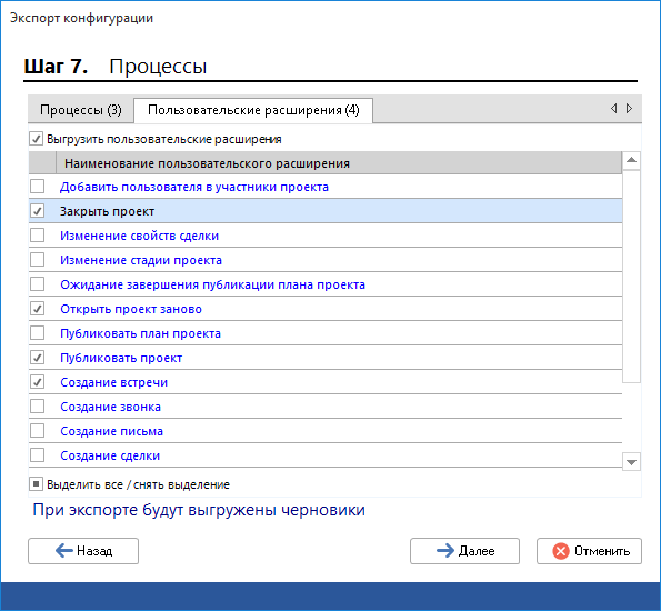 Выделить все / снять выделение – при установке данного флажка произойдет автоматическое выделение всех пользовательских расширений, доступных для экспорта.