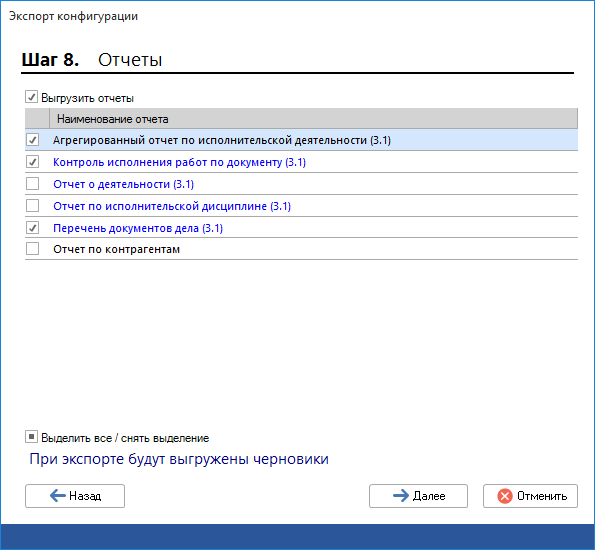 На данном шаге (рис. 16) необходимо указать отчеты, которые необходимо экспортировать. Экспортированы будут только черновики отчетов.