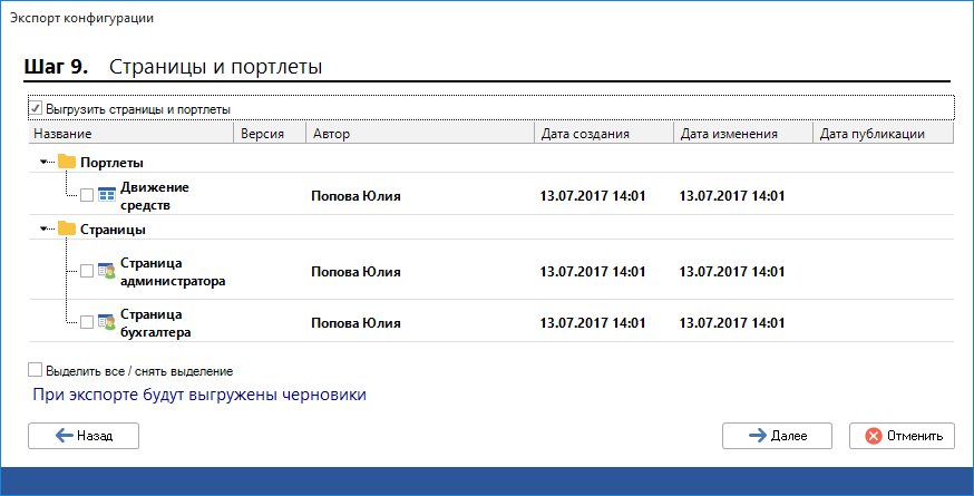 На данном шаге (рис. 17) необходимо указать портлеты и страницы, которые необходимо экспортировать. Экспортированы будут только черновики портлетов и страниц.