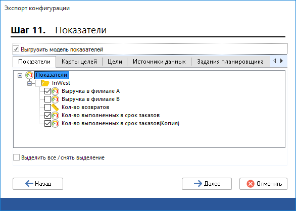 На данном шаге (рис. 19) требуется указать, необходимо ли экспортировать существующую в системе модель показателей. Для ее экспорта необходимо установить флажок Выгрузить модель показателей. После этого появится возможность выбрать объекты модели показателей (показатели, карты целей, цели, источники данных, задания планировщика), которые необходимо экспортировать. Выбор объектов осуществляется на соответствующих вкладках.