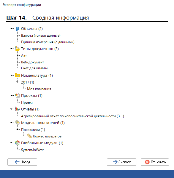 На данном шаге (рис. 22) отображается сводная информация обо всех экспортируемых объектах.
