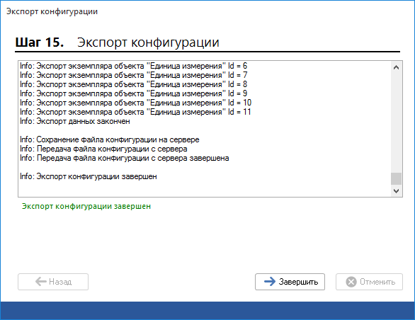 На данном шаге (рис. 23) происходит экспорт конфигурации – запись в файл экспорта данных, выбранных на предыдущих шагах экспорта. Данное диалоговое окно содержит информацию о ходе процесса экспорта данных.