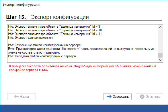 Рис. 24. Диалоговое окно экспорта конфигурации. Завершение экспорта конфигурации с ошибкой