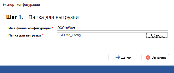Для продолжения процедуры экспорта конфигурации необходимо нажать на кнопку Далее.