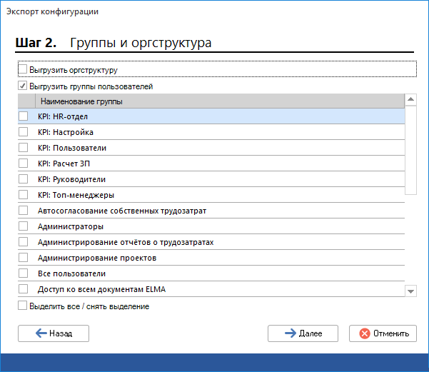 Выделить все / снять выделение – при установке данного флажка произойдет автоматическое выделение всех групп пользователей, доступных для экспорта.