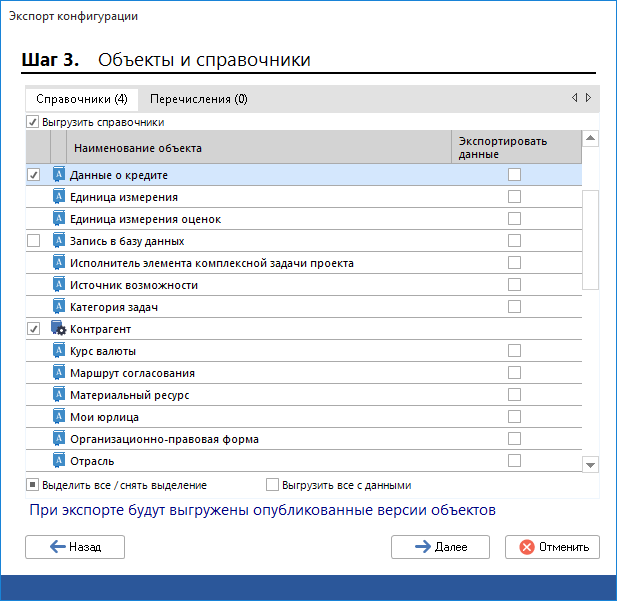 На данном шаге необходимо выбрать объекты (справочники) и перечисления, которые требуется экспортировать. Следует отметить, что при экспорте будут выгружены последние опубликованные версии выбранных объектов.