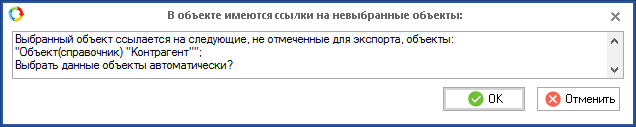 Следует отметить, что при наличии в системе связанных объектов и выборе в данном диалоговом окне только одного из них, система выдаст уведомление (рис. 7) о другом связанном объекте, который также необходимо экспортировать. В том случае, если будут экспортированы не все связанные объекты, в дальнейшем это может привести к возникновению конфликтов в системе во время импорта данной конфигурации.