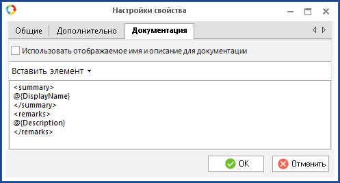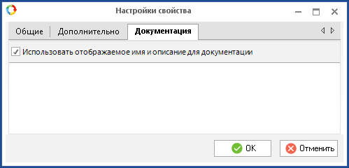 с установленным флажком "Использовать отображаемое имя и описание для документации"