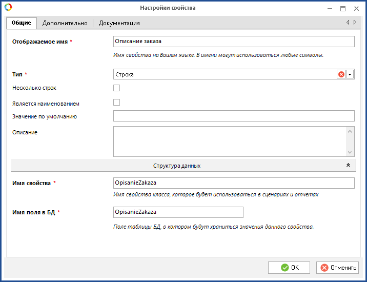 В блоке Структура данных можно посмотреть, и, при необходимости, изменить Имя свойства и Имя поля в БД. Данные из этого блока используются при написании сценариев, отчетов, шаблонов документов для операции Генерация документа и шаблонов Razor.