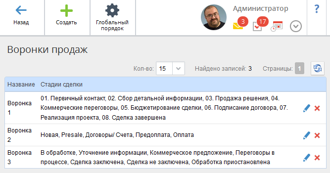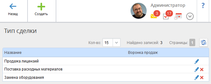 Данный справочник (рис. 1) предназначен для выполнения классификации сделок по определенным параметрам. Записи данного справочника используются при работе со сделками и при расширенном поиске в воронках продаж.
