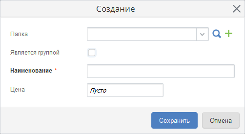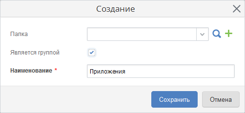 При создании записи справочника внутри папки в диалоговом окне создания записи (рис. 8) в поле Папка будет автоматически подставлено название текущей папки.