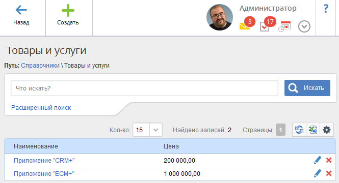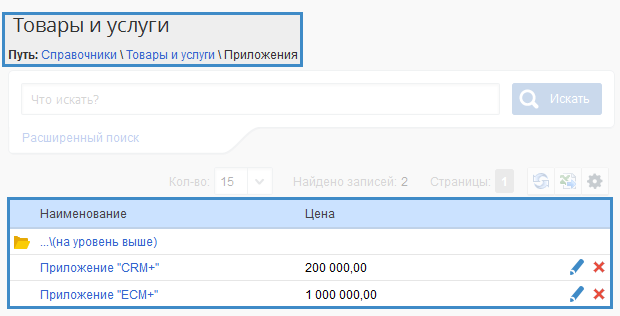 В данном справочнике (рис. 6) отображаются товары и услуги, которые могут участвовать в сделках. Записи данного справочника используются при работе со сделками. Подробнее см. в карточке сделки на вкладке Продукты.