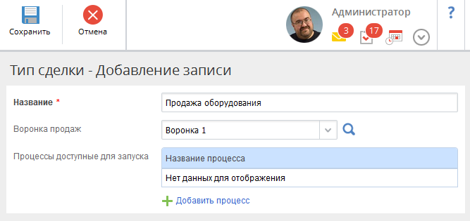 На данной форме необходимо ввести название типа сделки (данное поле является обязательным для заполнения). Типы сделок обеспечивают возможность удобной группировки сделок в системе по определенным параметрам. Кроме того, на данной форме может быть выбрана воронка продаж и процессы, доступные для запуска. При указании воронки продаж все сделки данного типа будут отображаться в отчете по выбранной воронке продаж, а также данные сделки будут иметь стадии, соответствующие выбранной воронке продаж.