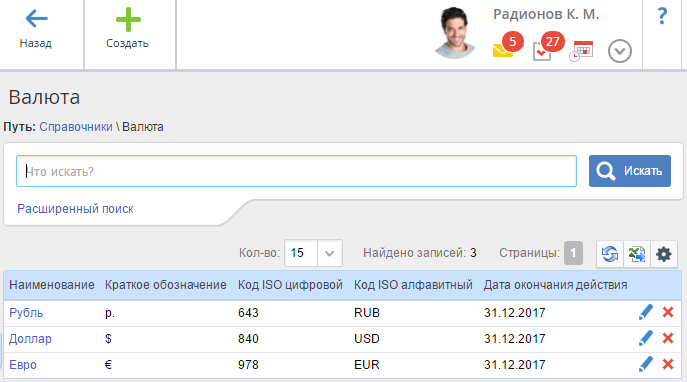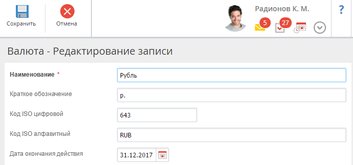 На данной форме необходимо ввести название валюты, краткое обозначение, коды ISO (цифровой и алфавитный), а также дату окончания действия записи в системе ELMA. Следует отметить, что краткое обозначение валюты носит информационных характер, а полное название валюты отображается в карточке сделки.