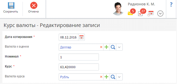 На данной форме необходимо заполнить дату котирования, валюту к оценке, номинал, курс и валюту курса и нажать на кнопку Сохранить.