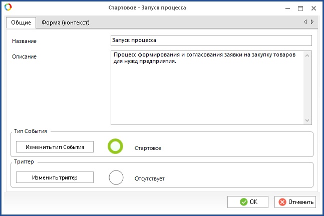 Триггер — отображает текущий выбранный триггер события. Кнопка Изменить триггер позволяет задать метод запуска процесса. В системе ELMA BPM реализовано два метода запуска и соответствующие им триггеры: