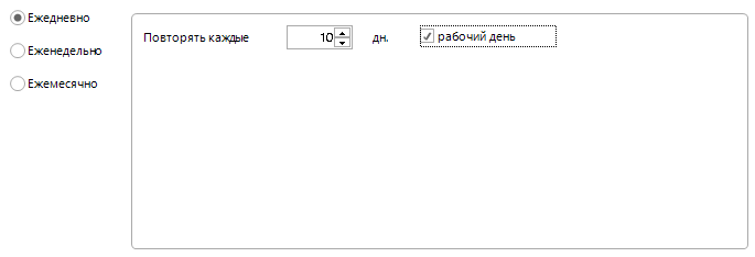Параметр Ежедневно позволяет настроить запуск нового экземпляра процесса по дням или раз в несколько дней, указав периодичность в поле Повторять каждые, а так же исключить выходные дни, активировав настройку рабочий день. Дата и время последующих активаций процедуры запуска экземпляра процесса вычисляется с момента первого запуска процесса.