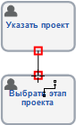 Для добавления нового перехода наведите курсор на элемент, от которого необходимо создать переход. По периметру элемента синими крестиками обозначатся узлы, из которых можно создать переход (рис. 1). Это места от которых можно провести соединение к другим элементам. При наведении курсора на синий крестик курсор примет вид красного квадрата. Нажмите левую клавишу мыши и, удерживая ее, проведите соединение к другому элементу. В точке, к которой можно подвести переход, появится второй красный квадрат. После того, как кнопка мыши будет отпущена, система создаст переход.