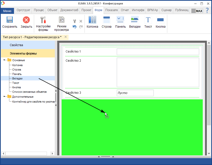 Для нанесения элемента на форму необходимо зажать кнопкой мыши выбранный элемент и переместить его на требуемое место на форме. При нанесении элементов на форму светло-зеленым цветом подсвечиваются доступные для размещения данного элемента места, а темно-зеленым цветом – место, в которое будет перенесен элемент (рис. 1).
