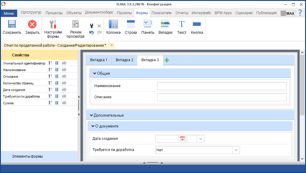 Рис. 1. Вкладка "Формы". Элемент "Колонка"