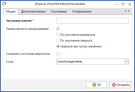 Свернута при пустых значениях – выбранная панель будет отображаться в веб-приложении в свернутом состоянии, если поля, расположенные на данной панели, не заполнены.