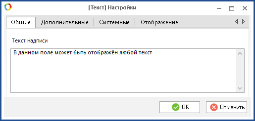 Каждый элемент Текст может быть настроен. Диалоговое окно настройки элемента Текст состоит из нескольких вкладок: Общие, Дополнительные,Системные и Отображение (рис. 2).