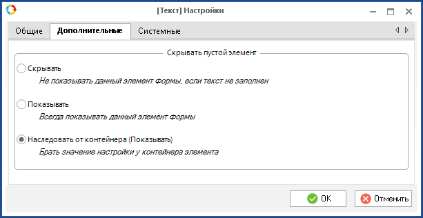 По умолчанию данные настройки наследуются из установленных настроек формы. При необходимости для данного элемента могут быть заданы настройки, отличные от настроек формы.