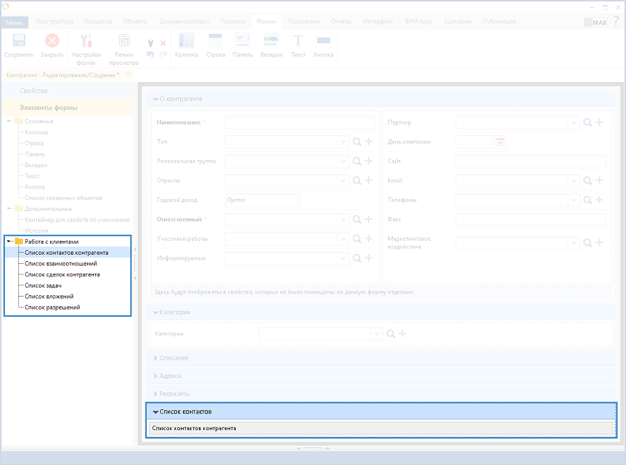 Рис. 1. Вкладка "Формы". Группа "Работа с клиентами". Элемент "Список контактов контрагента"