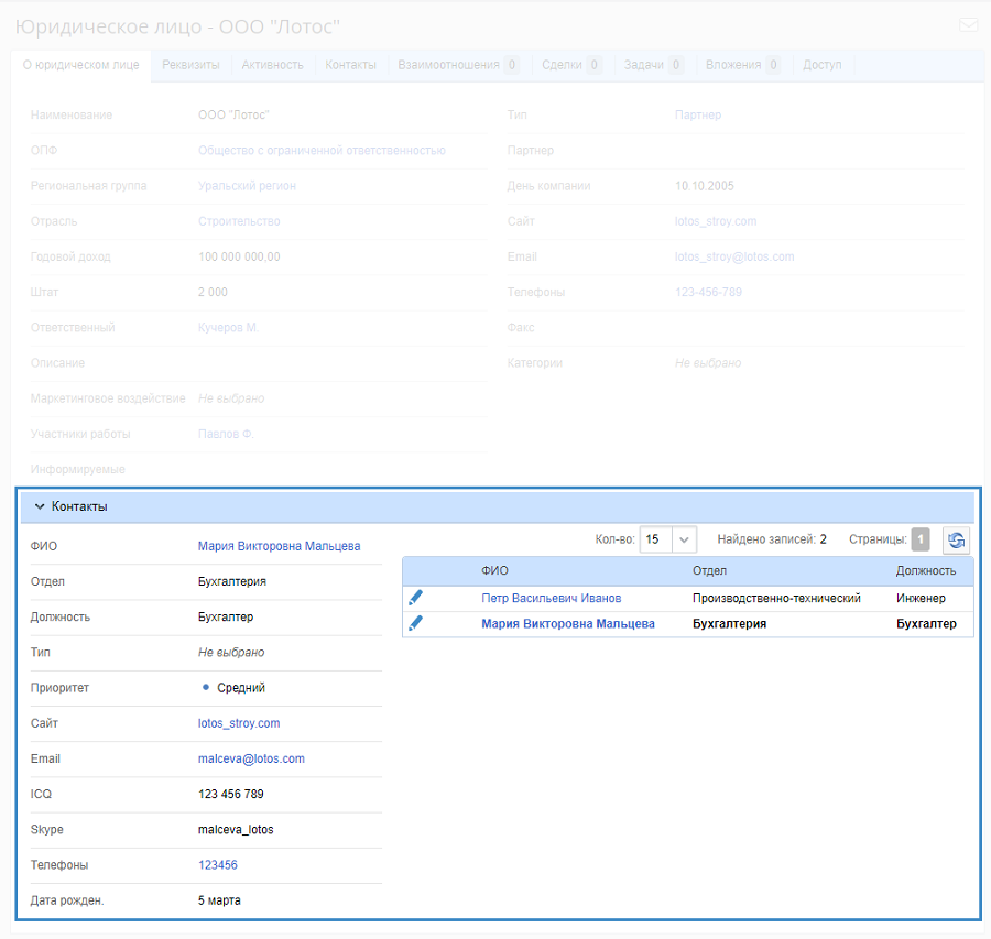 Рис. 2. Форма просмотра контрагента в веб-приложении. Элемент "Список контактов контрагента"