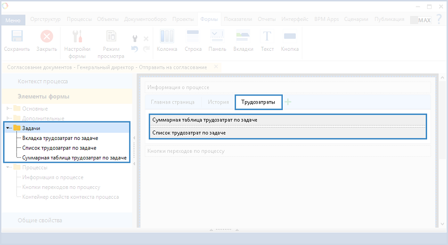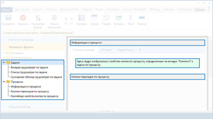 Рис. 3. Вкладка "Формы". Группы "Задачи" и "Процессы"