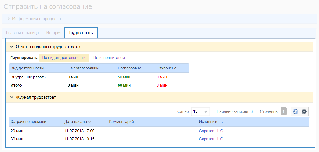 Рис. 6. Форма просмотра трудозатрат процессной задачи в веб-приложении