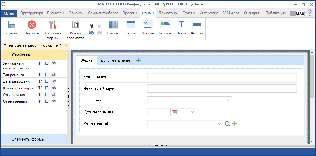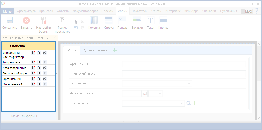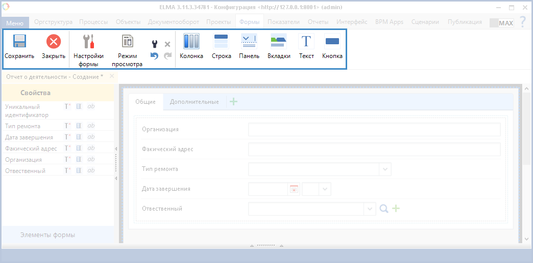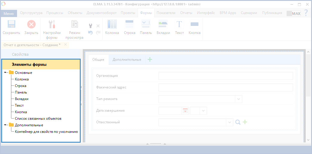 Рис. 1. Дизайнер ELMA. Вкладка "Формы"