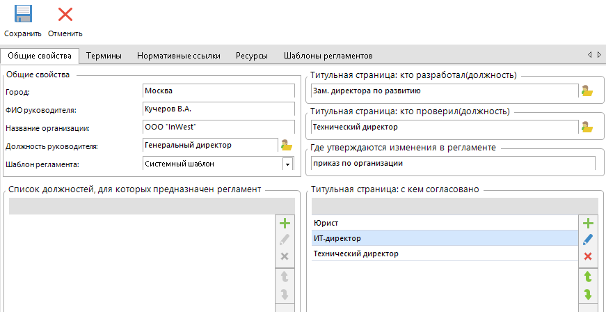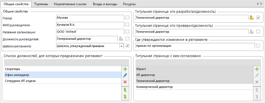 значения элементов списков Список должностей, для которых предназначен регламент, Титульная страница: с кем согласовано наследуются из глобальных настроек регламента. Унаследованные элементы списка не могут быть переопределены, но списки могут быть дополнены элементами, характерными для настраиваемого процесса.