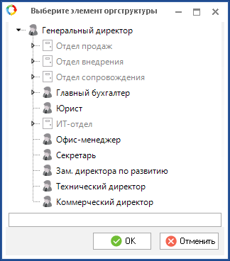 Значения полей Должность руководителя, Титульная страница: кто разработал (должность), Титульная страница: кто проверил (должность) могут быть введены вручную или выбраны из оргструктуры. Для выбора значения из оргструктуры, необходимо нажать кнопку . При этом появится окно выбора элемента оргструктуры (рис. 2).