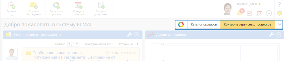 Система ELMA позволяет настроить список доступных в интерфейсе главных страниц. Пример ленты главных страниц представлен на рис. 1.