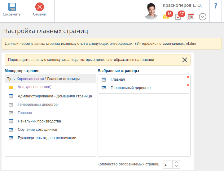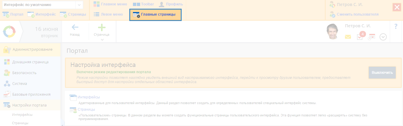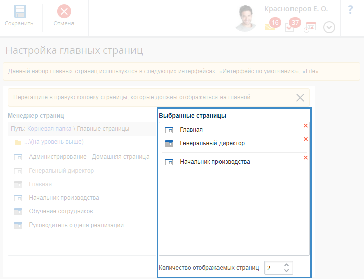 Пример страницы настройки главных страниц представлен на рис. 4.
