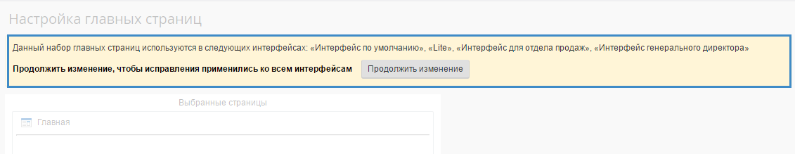 В случае, если редактируемый набор главных страниц используется в нескольких интерфейсах, при открытии набора главных страниц для редактирования отображается информация о том, в каких интерфейсах используется данный набор главных страниц. При внесении изменений в меню данные изменения отобразятся во всех интерфейсах. Для редактирования меню необходимо нажать на кнопку Продолжить изменения (рис. 3). Для того, чтобы настроить ленту главных страниц для конкретного интерфейса необходимо создать отдельную ленту главных страниц для данного интерфейса и настроить ее.