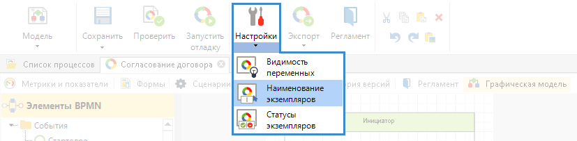 Чтобы определить способ именования экземпляров процесса, необходимо нажать на панели инструментов процесса в его карточке кнопку Настройки и выбрать пункт Наименование экземпляров (рис. 1).