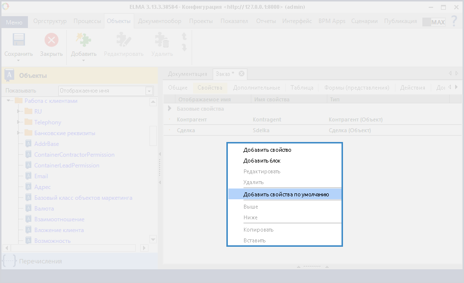 Свойства по умолчанию являются пользовательскими свойствами и отображаются в списке свойств аналогично пользовательским свойствам, но имеют предустановленные параметры. Для просмотра и редактирования данных параметров необходимо выбрать свойство и открыть карточку свойства объекта. Подробнее о редактировании свойства объекта см. соответствующий раздел справки.