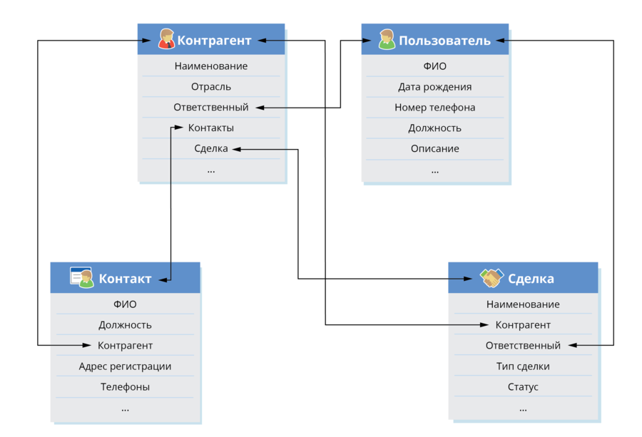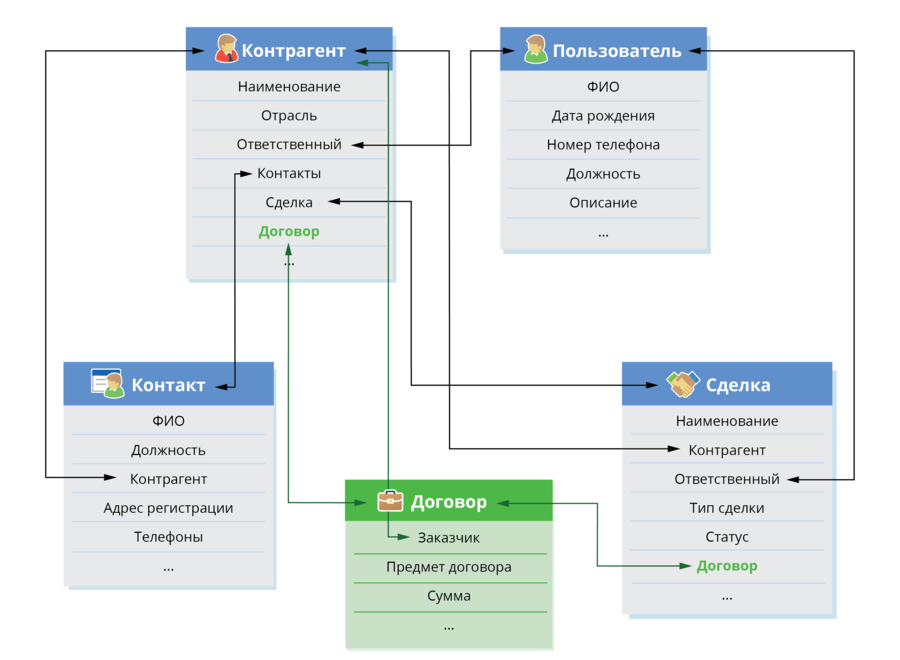 Объект– это сущность, имеющая определенный набор заданных параметров и свойств, определяющих ее поведение. Все данные в системе ELMA хранятся в виде объектов и взаимосвязей между ними. Примерами объектов являются: Контрагент, Задача, Звонок, Сделкаи т.д..