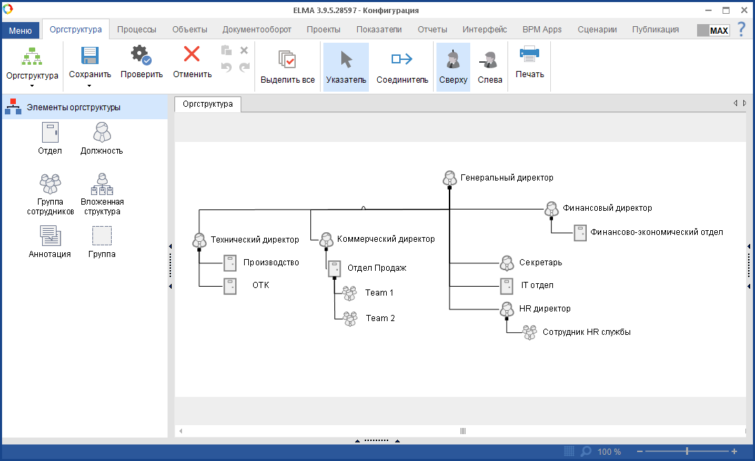 Рис.1. Пример модели оргструктуры в Дизайнере ELMA