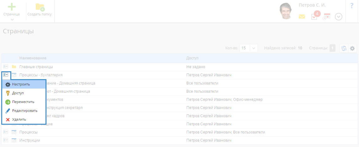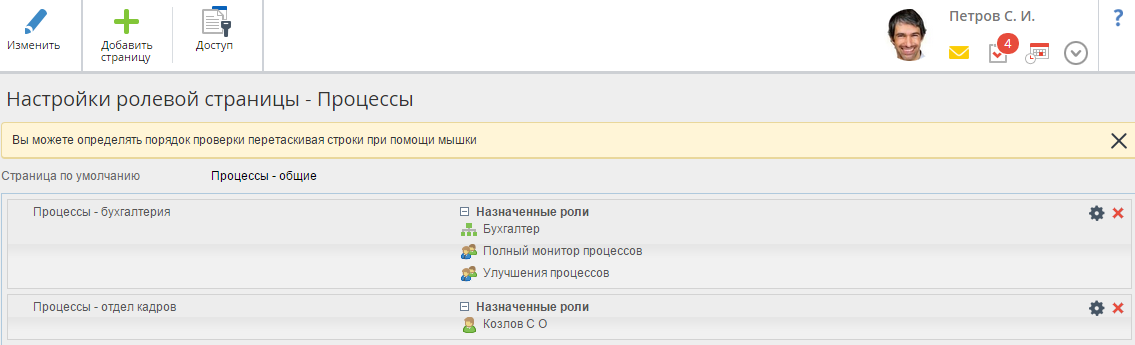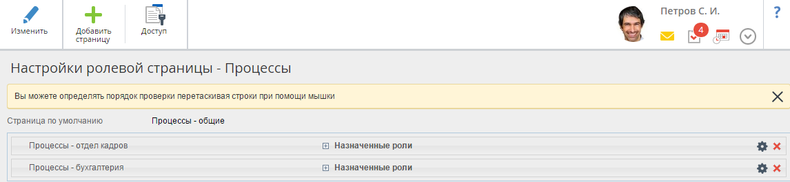 Пользователю будет показана первая страница из списка, к которой у него назначены роли. Поэтому следует располагать страницы в порядке убывания приоритета их показа. Для того, чтобы переместить страницу в нужное место списка, необходимо зажать ее кнопкой мыши и, удерживая ее, переместить в необходимое место списка.