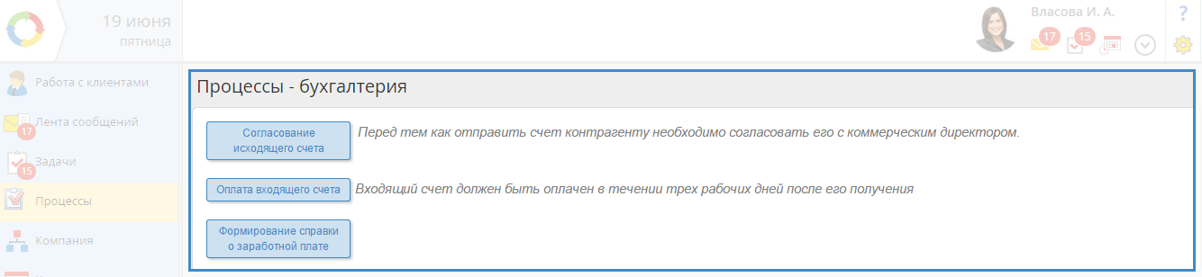 Например, при выборе в поле Страница * значения Процессы-бухгалтерия, а в поле Назначенные роли значения Бухгалтер, при открытии настраиваемой ролевой страницы для пользователя бухгалтер будет отображена страница Процессы – бухгалтерия (рис. 10).
