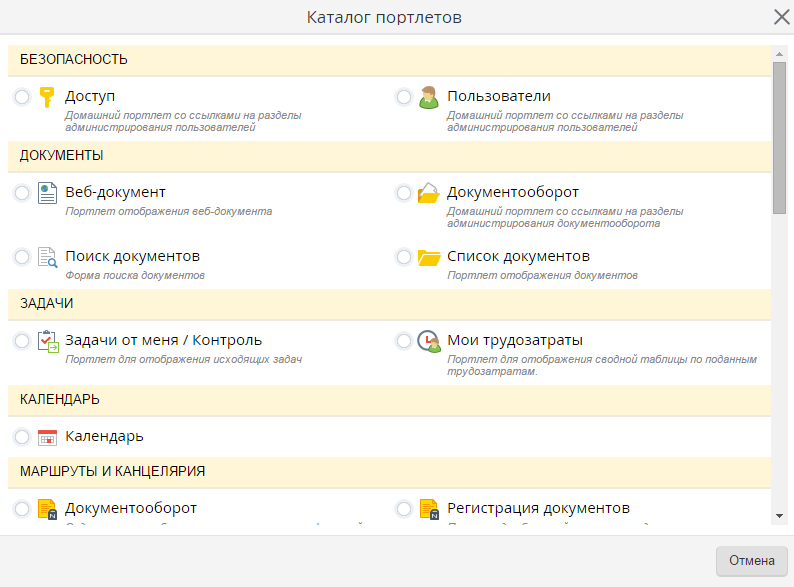Для того, чтобы добавить портлет на страницу, следует нажать на кнопку верхнего меню Добавить портлет и в открывшемся окне выбрать необходимый портлет (рис. 3).