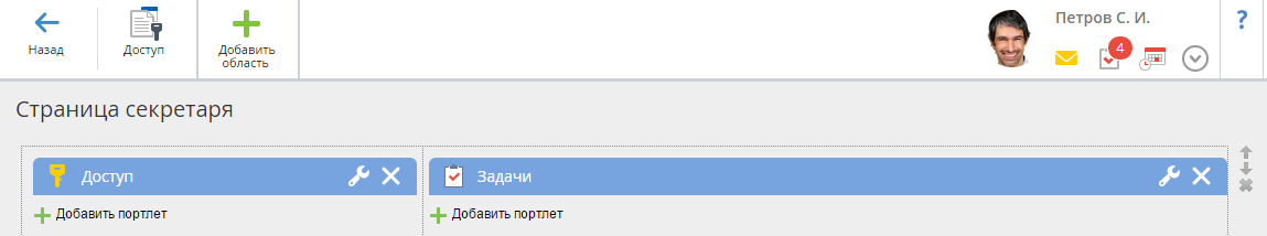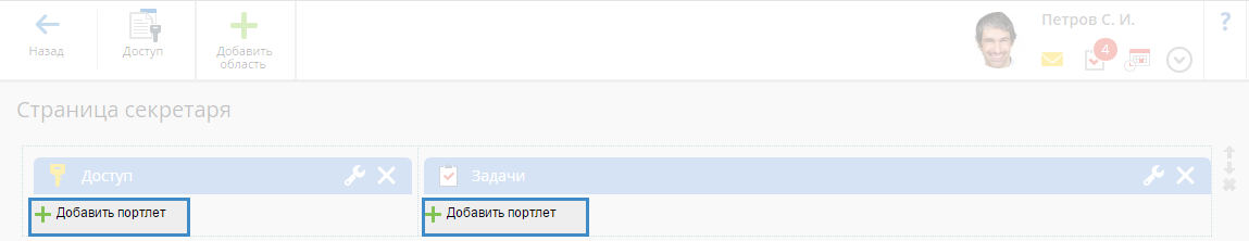 Кнопка добавления портлета. Данная кнопка отображается только в том случае, если при создании страницы был указан тип размещения Одна колонка или Две колонки
